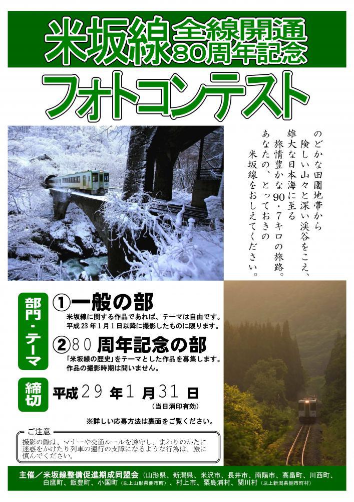 米沢駅(山形県米沢市)と坂町駅(新潟県村上市)を結ぶ米坂線は、昭和11年(1936年)に全線が開通して、今年(2016年)で80周年を迎えました。これを記念して、フォトコンテストを開催します。力強く疾走する車両、行きかう人々のふれあい、懐かしの沿線風景、旅の思い出など、あなたにとっての米坂線を表現してください。たくさんのご応募をお待ちしています。詳しくはこちらをご覧ください。応募・問い合わせは下記にお願いします。米坂線整備促進期成同盟会 事務局〒999-1363 山形県西置賜郡小国町大字小国小坂町2-70小国町総務企画課内 米坂線フォトコンテスト係 宛(電話 0238-62-2264 / ファックス 0238-62-5464)
