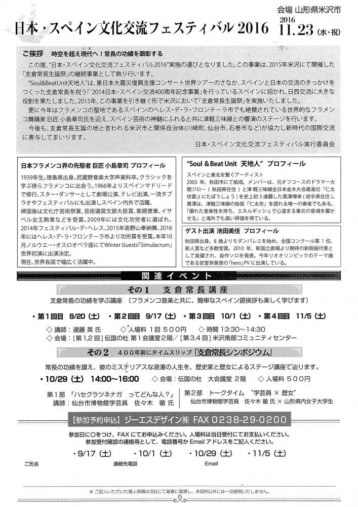 「日本・スペイン文化交流フェスティバル2016」は、「日本・スペイン文化交流フェスティバル実行委員会」が主催する、「支倉常長生誕祭」(2015年9月開催)の継続事業です。メインとなる「支倉常長賛歌」は11月23日(水・祝)に開催されますが、ここではその関連イベントである「支倉常長講座」と「支倉常長シンポジウム」についてご紹介します。 @支倉常長講座支倉常長の功績を学ぶ講座です(フラメンコ音楽と共に、簡単なスペイン語挨拶を学ぴます)。日時:第2回 9/17(土) 第3回 10/1(土) 第4回 11/5(土) 全て13時30分〜14時30分※第1回は終了しました会場:(第2回)伝国の杜 第1会議室 /(第3回・第4回)米沢南部コミュニティセンター入場料:1回 500円 A400年前にタイムスリップ「支倉常長シンポジウム」支倉常長の功績を讃え、彼のミステリアスな浪漫の人生を、歴史家と歴女によるステージ講座でたどります。日時:10/29 (土) 14時〜16時会場:伝国の杜 大会議室入場料:500円 詳細はこちらをご覧ください。また、「支倉常長シンポジウム」のトークタイムに参加する「歴女」を募集しています。詳細は当ホームページの当該記事をご覧ください。 皆様、是非ご参加いただき、米沢に生まれた「支倉常長」の魅力に触れてみてください。