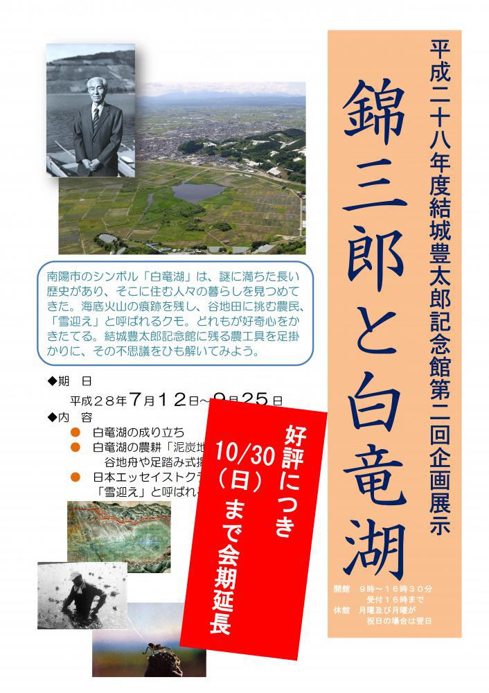 7月12日から始まった今年度第2回の企画展示「錦三郎と白竜湖」展が大好評。9月25日で終了予定であったが、延長の要望があり、約1か月延長し10月30日(日)まで開催することとした。南陽市の身近なシンボルとして市民の関心も高く、また専門の立場からの来館もあり大好評である。延長することとし、できるだけ多くの市民に見ていただくようPRしていきたい。