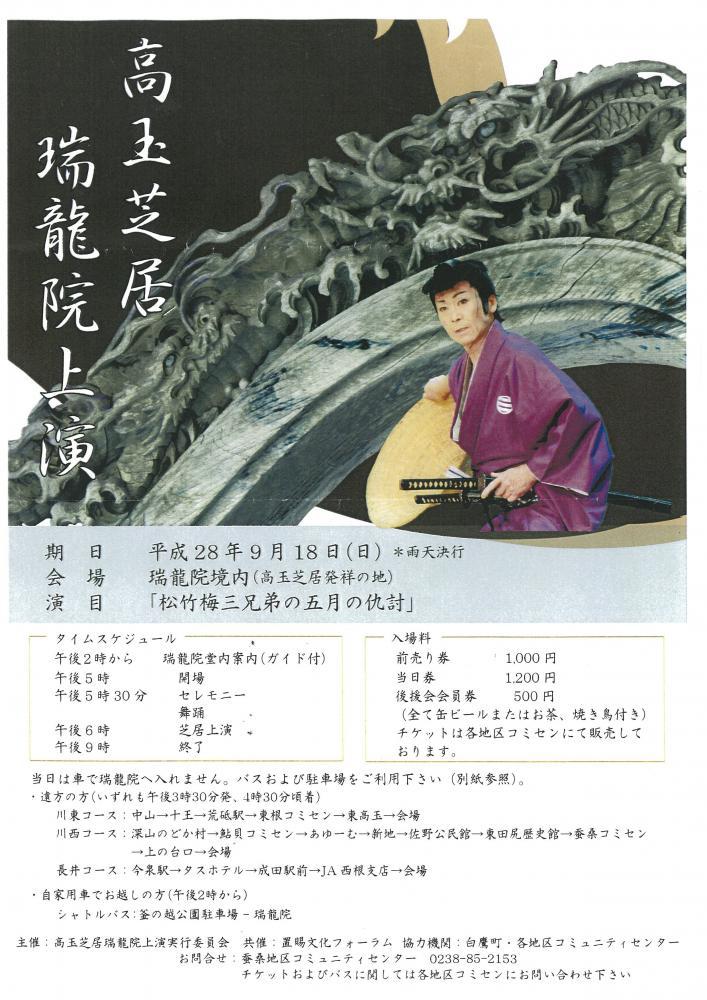 「高玉芝居瑞龍院上演」は、「高玉芝居瑞龍院上演実行委員会」が主催する、江戸時代より白鷹町西高玉地区に伝承されている町無形文化財である「高玉芝居」を、芝居の発祥地である瑞龍院で上演し、地域の文化振興と活性化を図ることを目的に開催されるイベントです。内容は、@瑞龍院境内の案内(ガイド付き) A芝居上演 となっております。詳しくはこちらです。皆様ぜひ足をお運びいただき、歴史と伝統芸能に触れてみてください。 〜高玉芝居瑞龍院上演〜日 時:平成28年9月18日(日) @瑞龍院境内案内 14時〜 A芝居上映 18時〜場 所:瑞龍院境内(白鷹町高玉4069)入場料:1,000円(前売り) 1,200円(当日) 500円(後援会会員)※瑞龍院に直接車で行くことはできません。釜の越農村公園に駐車していただき、主催者側で会場まで送迎します。詳しくはチラシ記載の「蚕桑(こぐわ)地区コミュニティセンター」や、白鷹町各地区コミセンまでお問い合わせください。