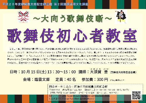 歌舞伎の「大向う」というのはどのような人か知っていますか。「大向う」とは歌舞伎を演じている途中に、見ている座席から「○○○○」と声をかける人のことを指し、役者ではない。がその役割を持つ組織があり、歌舞伎の芝居を盛り上げる重要な人である。今回はビデオ等を使い、歌舞伎の説明など歌舞伎を初めて学ぶ人にはもってこいの講座である。人数制限もあるのでお早めにお申し込みを。
