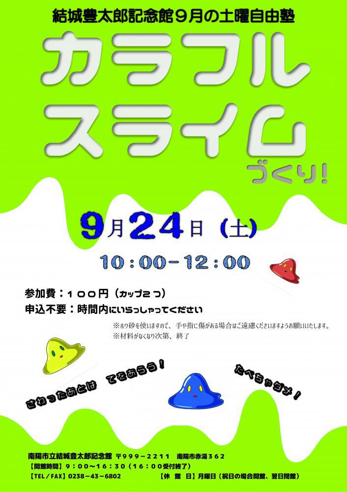 ▼9月の土曜自由塾「スライム」 申し込み不要で何人でも 9月24日土曜日午前10時から