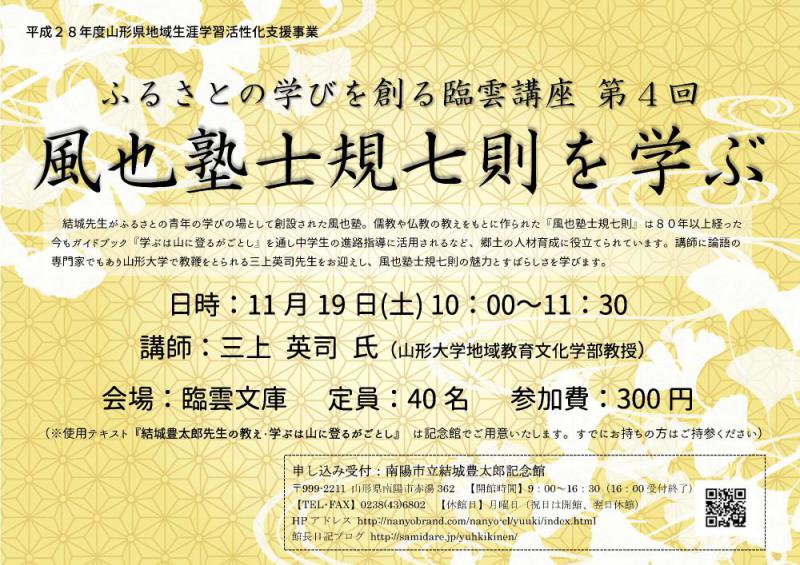 今年度最後の第4回臨雲講座は11月19日(土)に、今年度も山形大学地域教育文化学部の三上英司教授をお迎えし、風也塾士規七則の解説を行う予定にしている。1か月先の案内であるが、中身の濃い心に響くお話をお聞きできるのでぜひご参加を。申込は結城豊太郎記念館まで 電話・FAX 0238−43−6802お待ちしております。