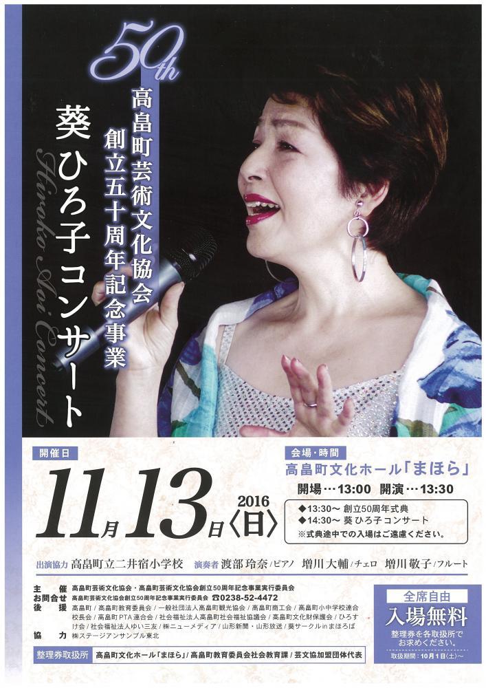 「高畠町芸術文化協会創立50周年記念事業」が、平成28年11月13日に、高畠町文化ホール「まほら」で行われます。開催内容は創立50周年式典と記念コンサートです。全席自由・入場無料となっておりますが、整理券をお求めください。整理券の取扱所や、詳しくはこちらをご覧ください。皆様ぜひご来場ください。