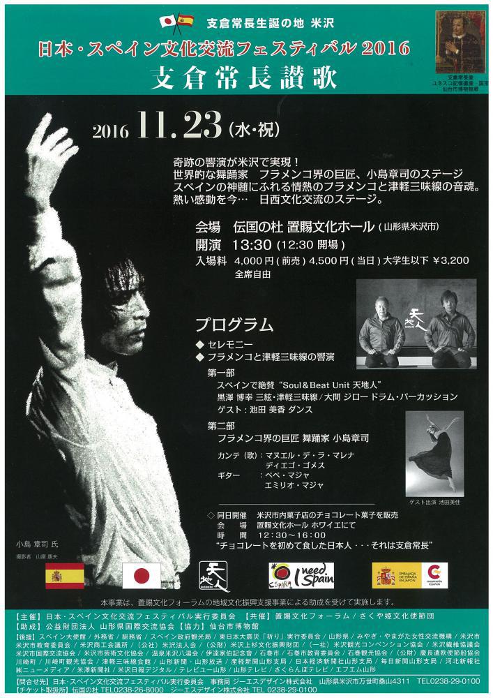 「日本・スペイン文化交流フェスティバル2016」は、「日本・スペイン文化交流フェスティバル実行委員会」が主催する、「支倉常長生誕祭」(2015年9月開催)の継続事業です。今まで「支倉常長講座」・「支倉常長シンポジウム」・「スペイン・バル料理を楽しむ」と紹介してきましたが、いよいよメインとなる「支倉常長賛歌」が11月23日に開催されます。世界的なフラメンコ舞踏家である「小島章司氏」を迎え、スペイン芸術の真髄に触れるとともに、津軽三味線「Soul&Beat Unit 天地人」との饗演を行います。詳細はこちらをご覧ください。日西文化交流のステージをご覧いただき、米沢に生まれた「支倉常長」に思いを馳せてみてください。 〜日本・スペイン文化交流フェスティバル2016 「支倉常長賛歌」〜日 時:平成28年11月23日(水・祝) 13時30分開演(12時30分開場)場 所:伝国の杜 置賜文化ホール(米沢市)入場料:4,000円(前売) 4,500円(当日) 3,200円(大学生以下) 全席自由その他:ホワイエにて米沢市内菓子店のチョコレート菓子を販売します。 「チョコレートを初めて食した日本人・・・それは支倉常長」