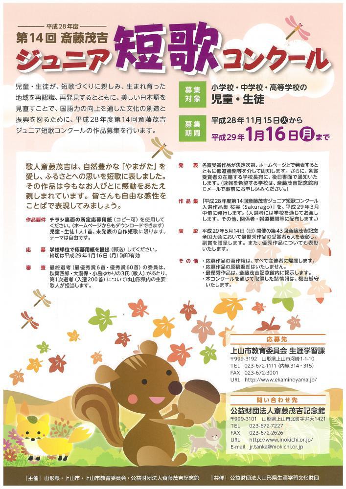 「第14回 斎藤茂吉ジュニア短歌コンクール」の作品募集を行います。児童・生徒が短歌づくりに親しみ、生まれ育った地域を再認識・再発見するとともに、美しい日本語を見直すことで、国語力の向上を通した文化の創造と振興を図るために開催されているものです。募集対象:小・中・高校生の児童・生徒募集期間:平成28年11月15日(火)から平成29年1月16日(月)まで詳しくはこちらをご覧ください。お問い合わせは(公財)斎藤茂吉記念館までお願いします。皆さん是非ご応募ください。