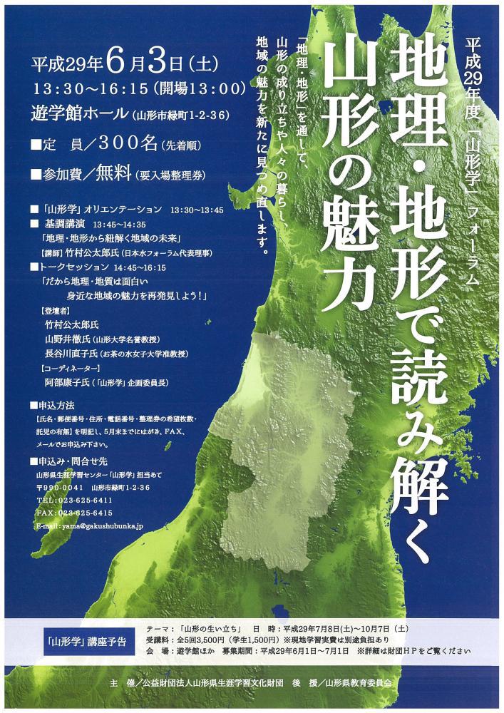 平成29年6月3日(土)に「山形学」フォーラム「地理・地形で読み解く山形の魅力」が開催されます。「地理・地形」を通して、山形の成り立ちや人々の暮らし、地域の魅力を新たに見つめ直してみませんか?場所:遊学館ホール(山形市緑町1-2-36)時間:13:30〜16:15(開場13:00)定員:300名(先着順)参加費:無料(要入場整理券)申込方法:氏名・郵便番号・住所・電話番号・整理券の希望枚数・託児の有無を明記し、5月末までにはがき、FAX、メールでお申し込みください。申込み・問合せ先:山形県生涯学習センター「山形学」担当あて〒992-0041 山形市緑町1-2-36TEL;023-625-6411FAX;023-625-6415???詳しくはPDFこちら(1.5MB)をクリックして下さい。