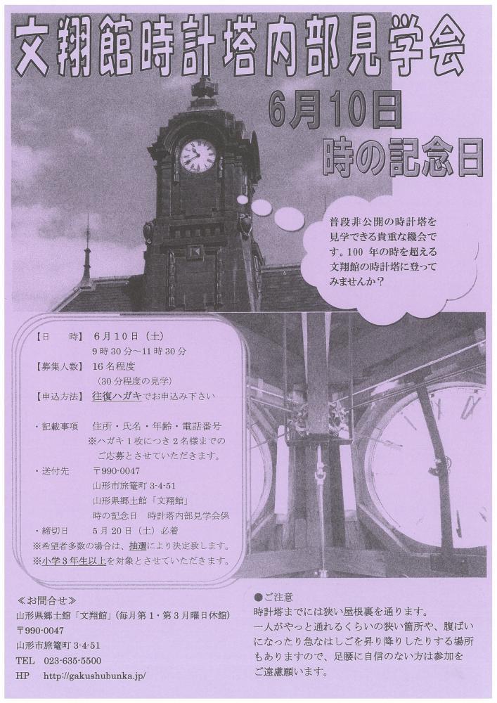 平成29年6月10日(土)に文翔館時計塔内部見学会を開催します。普段非公開の時計塔を見学できる貴重な機会です。100年の時を超える文翔館の時計塔に登ってみませんか? 日時:6月10日(土) 9時30分〜11時30分募集人数:16名程度(30分程度の見学)申込方法:往復ハガキでお申し込み下さい。記載事項:住所・氏名・年齢・電話番号*ハガキ1枚につき2名様までのご応募とさせていただきます。送付先:〒990-0047山形市旅篭町3-4-51山形県郷土館「文翔館」時の記念日 時計塔内部見学会係締切日:5月20日(土)必着*希望者多数の場合は、抽選により決定致します。*小学3年生以上を対象とさせていただきます。ご注意:時計塔までには狭い屋根裏を通ります。一人がやっと通れるくらいの狭い箇所や、腹ばいになったり急なはしごを昇り降りしたりする場所もありますので、足腰に自信のない方は参加をご遠慮願います。お問い合わせ:山形県郷土館「文翔館」(毎月第1.第3月曜日休館)〒990-0047山形市旅篭町3-4-51TEL 023-635-5500HP http://gakushubunka.jp/ 詳しくはPDFこちら(1.2MB)をクリック。