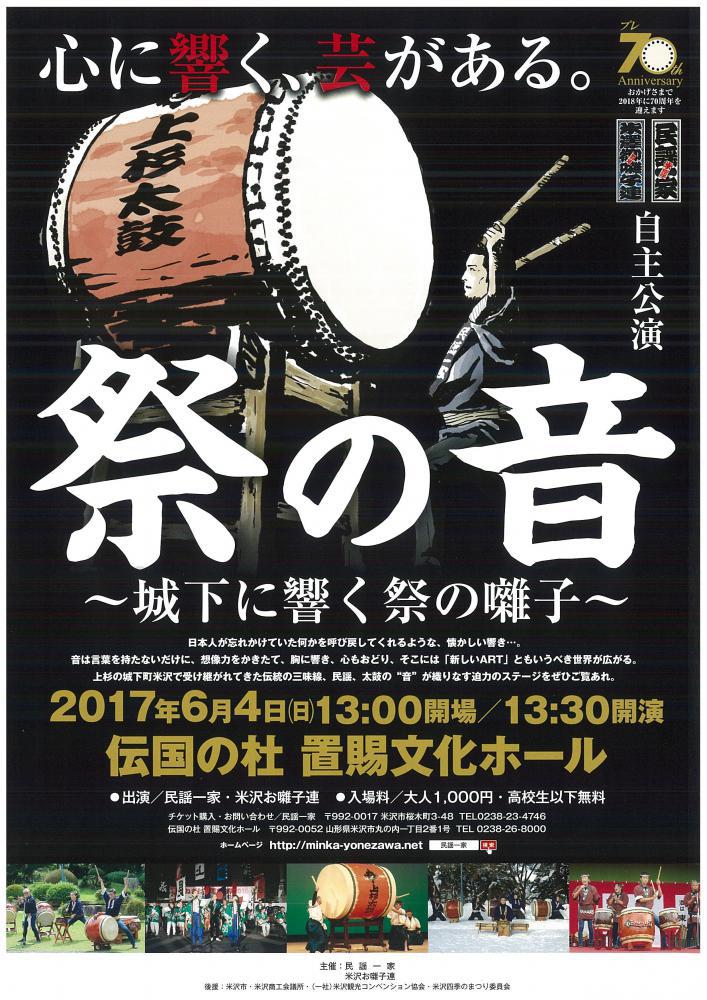 平成29年6月4日(日)に祭の音〜城下に響く祭の囃子〜が開催されます。日本人が忘れかけていた何かを呼び戻してくれるような、懐かしい響き・・・。音は言葉を持たないだけに、想像力をかきたて、胸に響き、心もおどり、そこには「新しいART」ともいうべき世界が広がる。上杉の城下町米沢で受け継がれてきた伝統の三味線、民謡、太鼓の“音”が織りなす迫力のステージを是非ご覧あれ。日時:6月4日(日) 開場13:00 開演13:30場所:伝国の杜 置賜文化ホール 〒992-0052 米沢市丸の内一丁目2番1号 TEL0238-26-8000入場料:大人1000円 高校生以下無料チケット購入・お問い合わせ:民謡一家 〒992-0017 米沢市桜木町3-48 TEL0238-23-4746ホームページ:http://minka-yonezawa.net詳しくはPDFこちら(1.2MB)をクリック。 ●このイベントは置賜文化フォーラムで実施している「地域文化振興支援事業」の補助事業です。