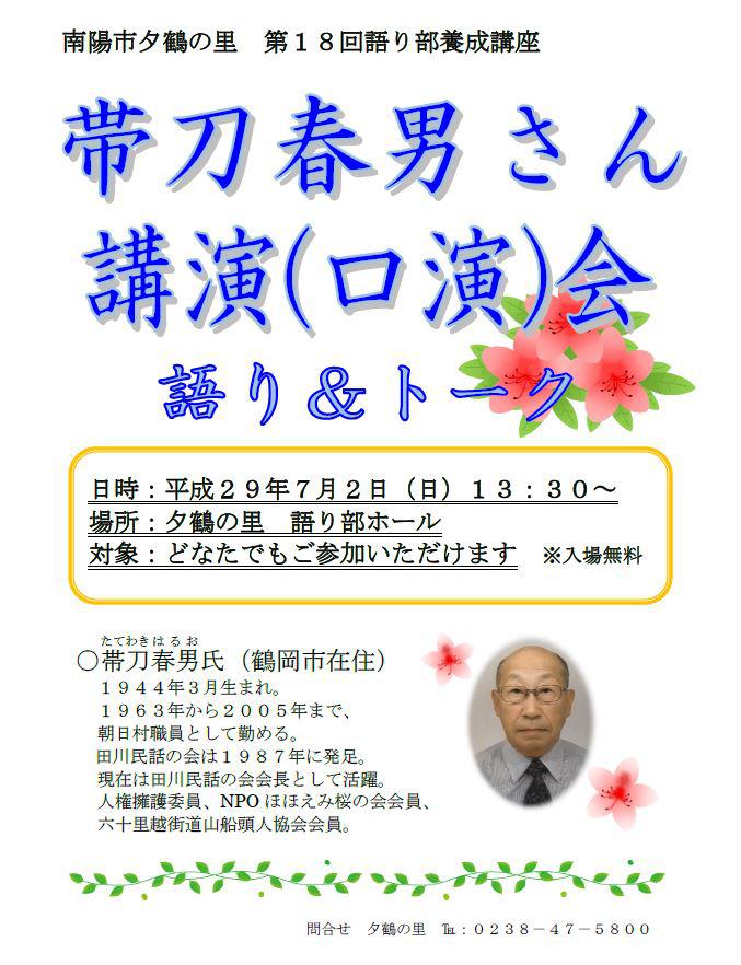 ▼帯刀春男さん講演(口演)会 開催のお知らせ