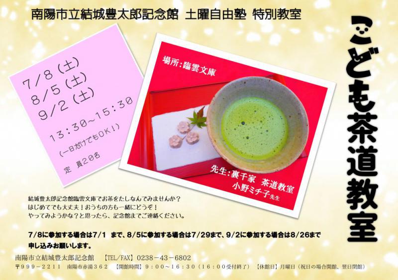 月1回の土曜自由塾は好評のうちに第1回講座が終了した。これからも月1回の予定で開講するが、この定例講座とは別に、ボランティアでお茶を指導してくださっている小野ミチ子さんからお茶教室を子ども達に教えたいと、3回のお茶教室を開講することになった。第1回はすで受付が終了しているが、市民の善意で開かれることに感謝している。