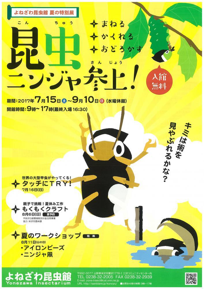 よねざわ昆虫館で夏の特別展昆虫ニンジャ参上!が開催されます。何かのマネをして身を守る昆虫たちの生態を「擬態」といいます。昆虫たちが生き残るために使う技は、どれも忍者の術のようでビックリするものばかり。キミは術を見やぶれるかな?この展示を観れば身近な昆虫ニンジャの変化を見やぶりたくなることまちがいなし!!期間:2017年7月15日(土)〜9月10日(日)【水曜休館】開館時間:9時〜17時(最終入場16:30)内容:○7月16日(日)世界の大型甲虫がやってくる!タッチにTRY!○8月6日(日)親子で挑戦!夏休み工作もくもくクラフト*要予約○8月11日(山の日)夏のワークショップ、アイロンビーズ、ニンジャ凧*有料所在地:山形県米沢市簗沢1776−1三沢コミュニティーセンター内電話番号:0238−32−2005(お問い合わせ9時〜17時まで)詳しくはPDFこちら(1.8MB)をクリックしてください