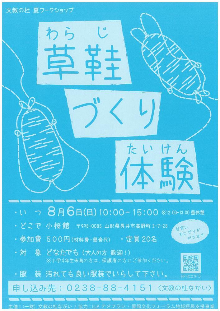 2017年8月6日(日)に草鞋づくり体験が開催されます。 日時:8月6日(日)10:00〜15:00(12:00〜13:00昼休憩)場所:小桜館 〒993-0085 山形県長井市高野町2-7-28参加費:500円(材料費・昼食代)*昼食におにぎりがつきます。定員:20名対象:どなたでも(大人の方歓迎)*小学4年生未満の方は、保護者の方とご参加ください。服装:汚れてもいい服装でいらして下さい。申込先:0238-88-4151〈文教の杜ながい〉ホームページ:https://bunkyounomori.jimdo.com/詳しくはPDFこちらを(1MB)クリック。●このイベントは置賜文化フォーラムで実施している「地域文化振興支援事業」の補助事業です。