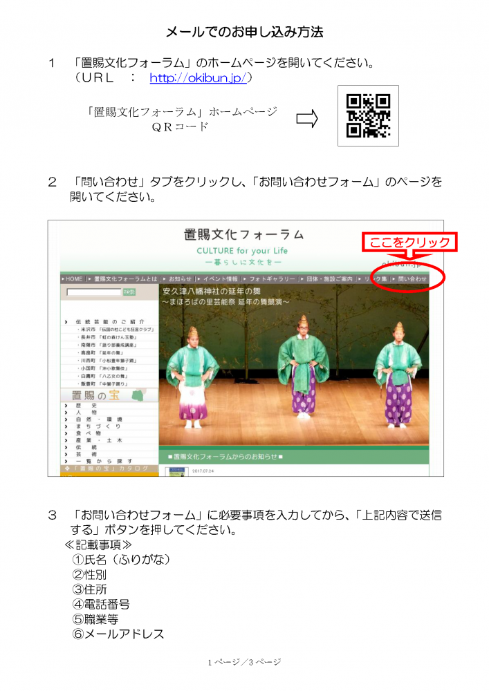 参加者募集中のアートマネジメント事業「街が面白くなる、アート企画のつくり方」へのお申し込み方法を詳しくご説明します。(参加者募集チラシなどはこちらをご覧ください ⇒ http://okibun.jp/log/?l=437780 )詳しいお申し込み方法はこちら(PDF 423KB)をご覧ください(上記画像3枚分を統合したPDFファイルです。)お電話でのお問い合わせもお待ちしております。お問い合わせ電話番号は 0238-26-6020 です。(置賜文化フォーラム事務局(山形県置賜総合支庁総務課連携支援室内) 8時30分〜17時まで)