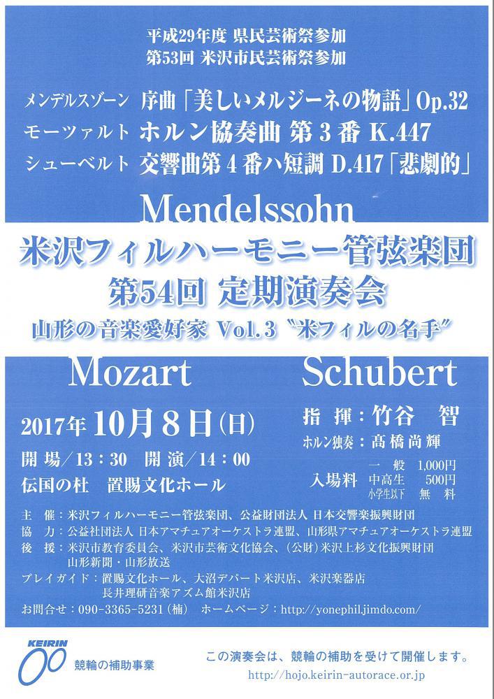 2017年10月8日(日)に米沢フィルハーモニー管弦楽団第54回定期演奏会〜山形の音楽愛好家vol.3〜“米フィルの名手”が開催されます。日時:2017年10月8日(日)開場/13:30 開演/14:00場所:伝国の杜 置賜文化ホール入場料:一般 1,000円/中高生 500円/小学生以下 無料お問い合わせ:090-3365-5231ホームページ:http://yonephil.jimdo.com/詳しくはPDFこちら(1MB)をクリック!!