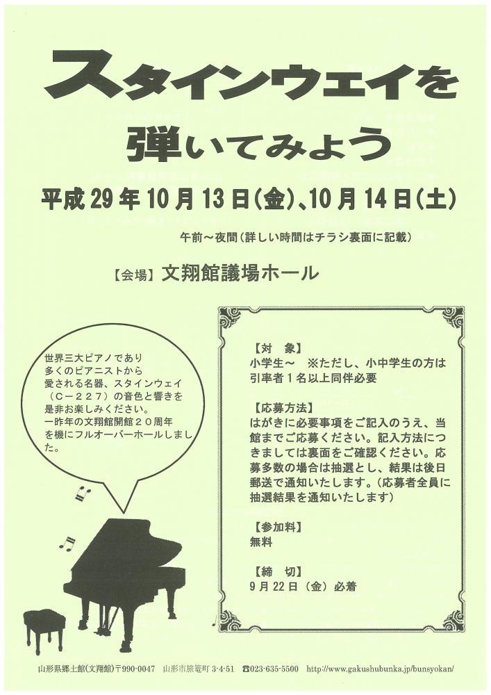 平成29年10月13日(金)、10月14日(土)にスタインウェイを弾いてみようが開催されます。 日時:平成29年10月13日(金)、10月14日(土)場所:文翔館議場ホール時間:午前〜夜間(詳しい時間はチラシに記載されています)対象:小学生から*ただし、小中学生の方は引率者1名以上同伴必要応募方法:チラシをご参照ください。参加料:無料締切:9月22日(金)必着 詳しくはPDFこちら(1.3MB)をクリック!!