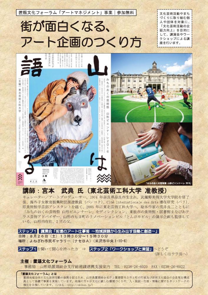 「置賜が面白くなる」展覧会をみんなで一緒に企画してみませんか。 全国から6万人を集める「みちのおくの芸術祭 山形ビエンナーレ」仕掛け人でもある東北芸術工科大学の宮本准教授と一緒に、いま「アートでできること」をみんなで考えましょう。 ■日時 ●ワークショップ@企画会議をしよう 9月12日(火)19時〜21時/場所:置賜総合文化センター(米沢市金池3−1−14) ●ワークショップA展示プランを考えよう 10月10日(火)19時〜21時/場所:置賜総合文化センター(米沢市金池3−1−14) ●展覧会場をつくろう 場所:よねざわ市民ギャラリー(ナセBA)(米沢市中央1−10−6) ・12月 2日(土)展覧会設営 ・12月 3日(日)オープニング ・12月10日(日)撤収■参加申込方法/置賜文化フォーラムあてメール又はFAXにてお申込ください。■参加申込〆切/9月4日(月)■問合せ/置賜文化フォーラム事務局(置賜総合支庁連携支援室内)■参加費/無料です。■詳細はチラシ(PDF 802KB)をご覧ください。■メールでのお申し込みの方法を詳しくご説明しています。こちら(PDF 424KB)をご覧ください。 ステップ1に参加したかったのに、参加できなかった方、ステップ2からの参加も可能です。皆さまの参加をお待ちしています!