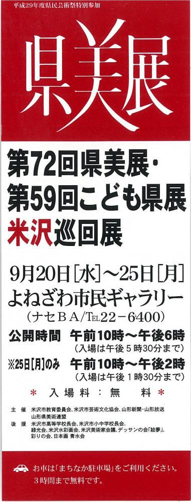 9月20日(水)〜25日(月)まで、よねざわ市民ギャラリー(ナセBA)で第72回県美展・第59回こども県展米沢巡回展が開催されます。 期間:9月20日(水)〜9月25日(月)場所:よねざわ市民ギャラリー(ナセBA/TEL:0238-22-6400)公開時間:午前10時〜午後6時(入場は午後5時30分まで)*25日(月)のみ、午前10時〜午後2時まで(入場は午後1時30分まで)入場料:無料 *お車は「まちなか駐車場」をご利用下さい。3時間まで無料です。