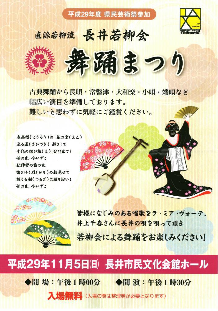 平成29年度 県民芸術祭参加 直派若柳流 長井若柳会 舞踊まつり 日時:平成29年11月5日(日) 長井市民文化会館 ホール 開場:午後 1時00分 開演:午後 1時30分 ♦入場無料(入場の際は整理券が必要となりますので、ご注意ください。)整理券配布先: コンノ美容室 ・ビューティーサロンコンノ ・長井市民文化会館お問合わせ: 秀美 (携帯090−5238−3789) / 志津香 (携帯090−2953−4927) 長井市民文化会館 0237−84−6051