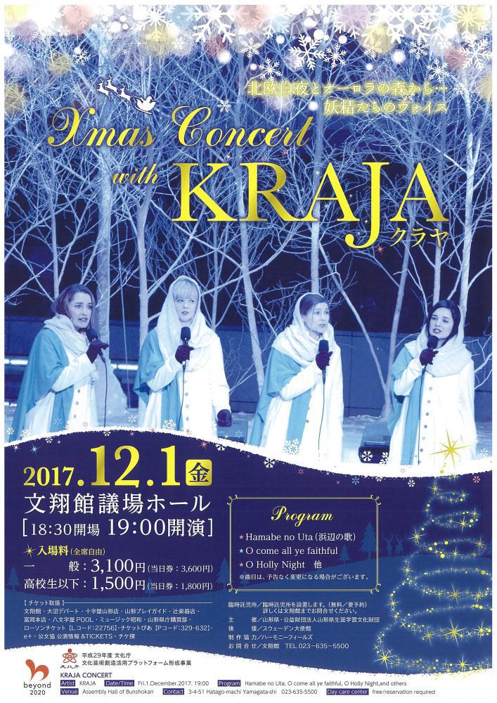 平成29年12月1日(金)に『KRAJA(クラヤ)コンサート』が開催されます。KRAJA(クラヤ)は、スウェーデン北部の都市ウメオを拠点に活躍する女性コーラスグループです。『キュールニング』というスウェーデン伝統の歌唱法を用いて、安らぎを求める思いや生きる意味を問う人々の心を美しいコーラスワークで表現しています。 ●日時:平成29年12月1日(金)●開場18:30/開演19:00●会場:文翔館 文翔館議場ホール●入場料:一般3,100円(当日3,600円)/高校生以下1,500円(当日1,800円)●お問い合わせ:023-635-5500(文翔館)詳しくはPDFこちら(1.7MB)をクリック!!