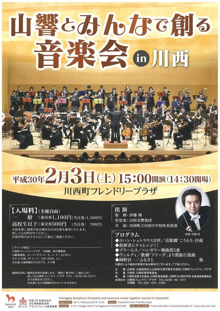 2018年2月3日(土)に「山響とみんなで創る音楽会 in 川西」が開催されます。山形交響楽団と地元の学生との共演で創り上げる音楽会です。ぜひ、ご来場ください! ●日時:2018年2月3日(土)/開場14:30/開演15:00●会場:川西町フレンドリープラザ●入場料(前売券):一般 1,100円/高校生以下 500円●お問合せ:川西町フレンドリープラザ(TEL:0238-46-3311)、文翔館(TEL:023-635-5500) 詳しくはPDFこちら(1.3MB)をクリック!!