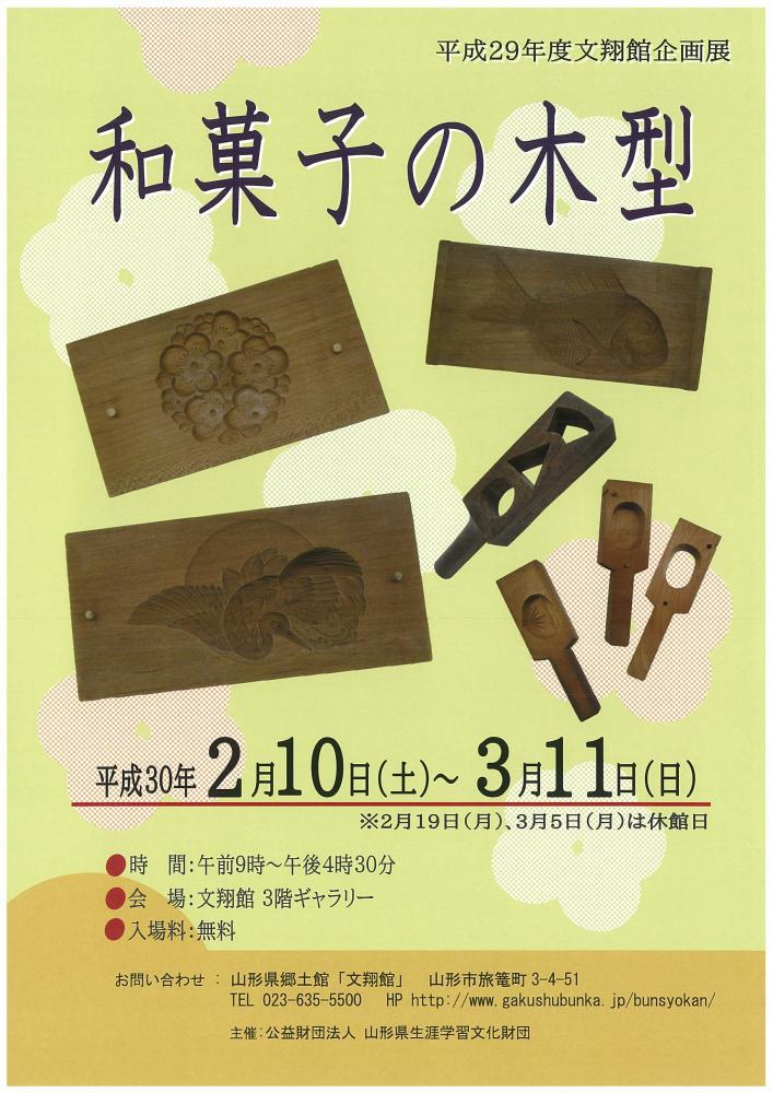 平成30年2月10日(土)から、「平成29年度文翔館企画展 和菓子の木型」が開催されます。●日時:平成30年2月10日(土)〜3月11日(日) 午前9時〜午後4時30分 ※ 2月19日(月)、3月5日(月)は休館日●会場:文翔館3階ギャラリー(山形市旅篭町3−4−51)●入場料:無料です!●お問い合わせ:023-635-5500(文翔館)詳しくはPDFこちら(1.1MB)をクリック!!