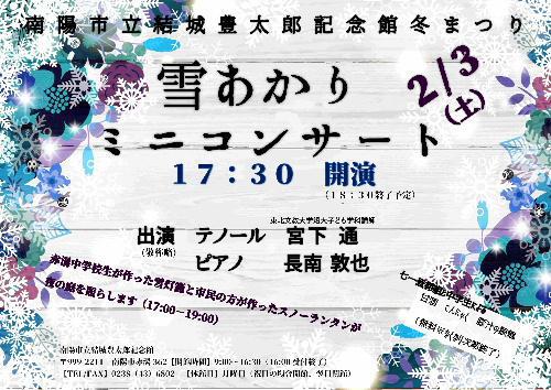 記念館ロビーでは雪あかりミニコンサートで寒い冬の夜のひと時、気持ちをほんのりとあたたかくしてみてはいかがです。