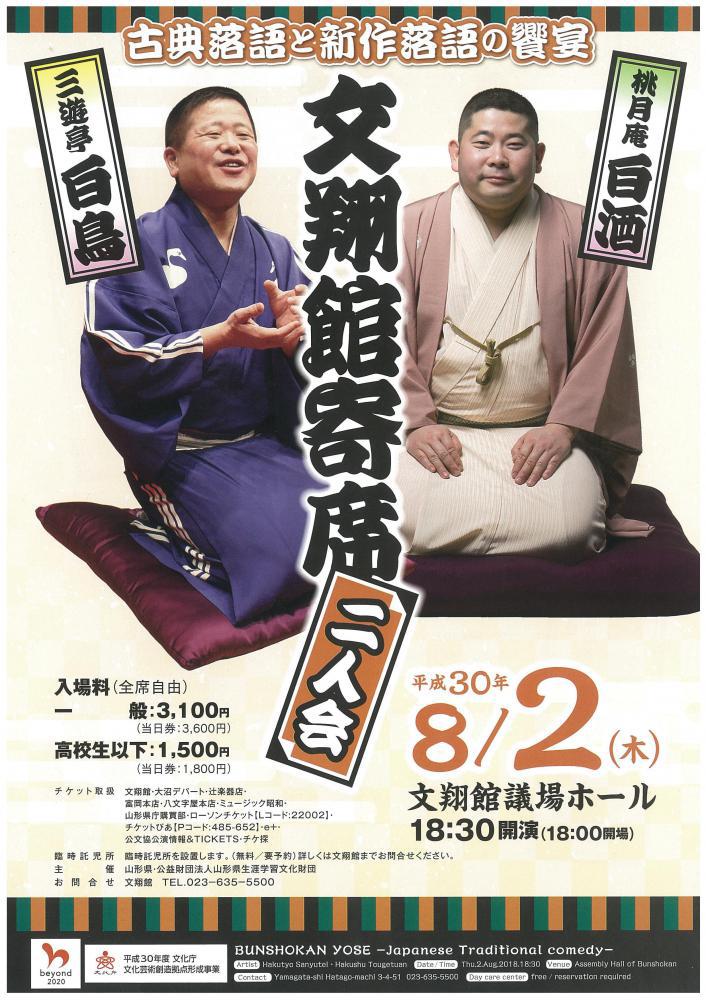 「文翔館寄席ニ人会」のお知らせです。いま絶対聴きたい噺家二人!!文翔館寄席開幕●日時:平成30年8月2日(木)18:30開演(18:00開場)●場所:文翔館 議場ホール●入場料(全席自由):【一般】¥3,100(当日¥3,600)【高校生以下】¥1,500(当日¥1,800)●お問い合わせ:山形県郷土館「文翔館」(TEL:023-635-5500)詳しくはこちら(PDF2.0MB)をクリック!