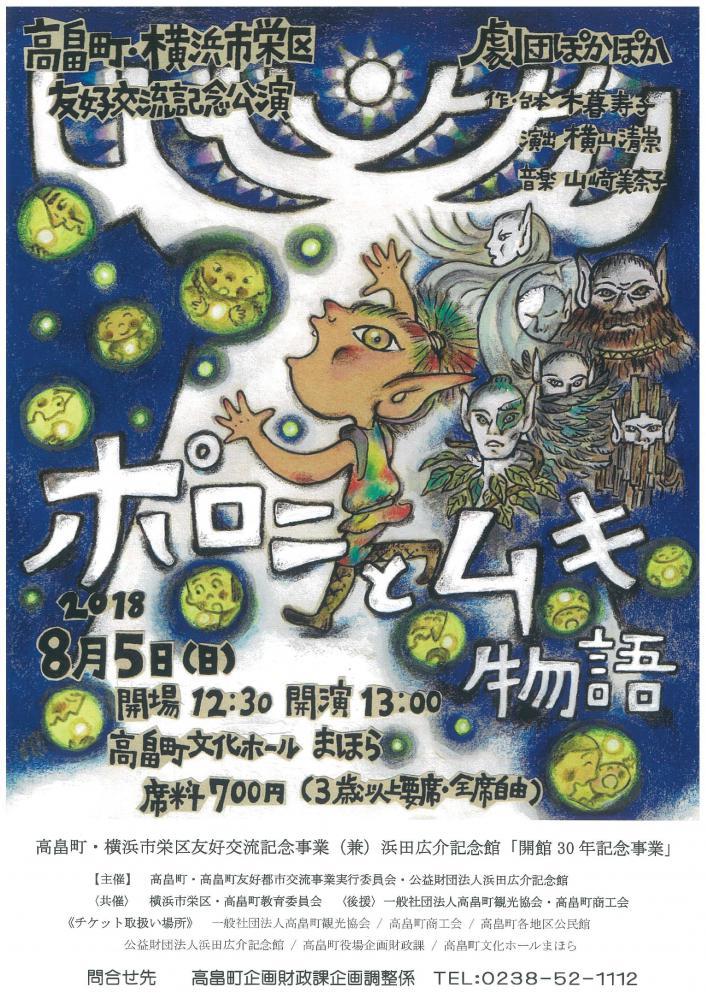 劇団ぽかぽか「ポロニとムキ物語」のお知らせです。平成29年11月11日に高畠町と横浜市栄区が友好交流宣言を発表したことを記念して、オリジナル作品「ポロニとムキ物語」を上演します。●日時:平成30年8月5日(日)13:00開演(12:30開場)●場所:高畠町文化ホール まほら●入場料:700円(3歳以上要席・全席自由)●お問い合わせ:高畠町企画財政課企画調整係(TEL:0238-52-1112)詳しくはこちら(PDF1.3MB)をクリック!