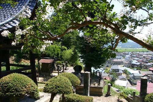 ▼東正寺の結城翁の墓地「柳子地蔵尊」の覆いを修理 東正寺に真っ白な百日紅