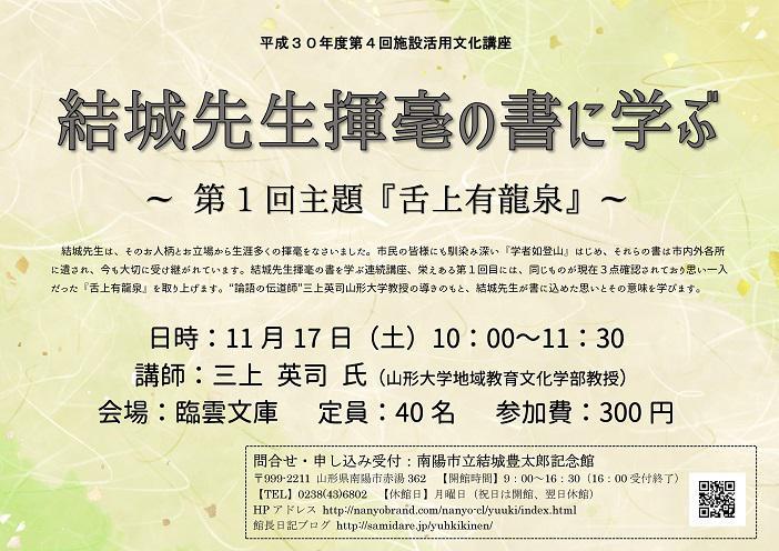 結城翁は山形中学時代の書道の先生のてほどきを受け、生涯にわたって書に親しむようになったと言われており、数多くの書を書き残している。その書の原典は中国の古典だったり、仏典だったりしている。今回の講座は、これら結城翁の書の解説を山形大学の三上教授にお願いし、今後何年かにわたって継続して行っていきたいと計画し、ご快諾いただき実現をみた。最初に解説していただく書は「舌上有龍泉」である。どのような思いが込めれた書であろうか。