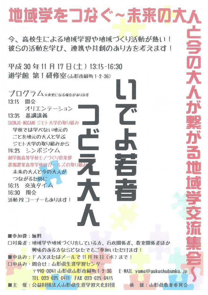 「地域学をつなぐ〜未来の大人と今の大人が繋がる地域学交流集会〜」のお知らせです。いでよ若者 つどえ大人 ●日時:平成30年11月17日(土)13:15〜16:30●場所:遊学館 第1研修室●対象者:地域学や地域づくりをしている方、行政関係者、教育関係者ほか興味のある方●参加料:無料●申込: FAX 023‐625‐6415(チラシ裏面で) 又は、 E-MAIL yama@gakushubunka.jp●締切:平成30年11月14日(水) ※お問合せ:山形県生涯学習センター(TEL 023-625-6411) ※詳しくはこちら(PDF1.5MB)をクリック!