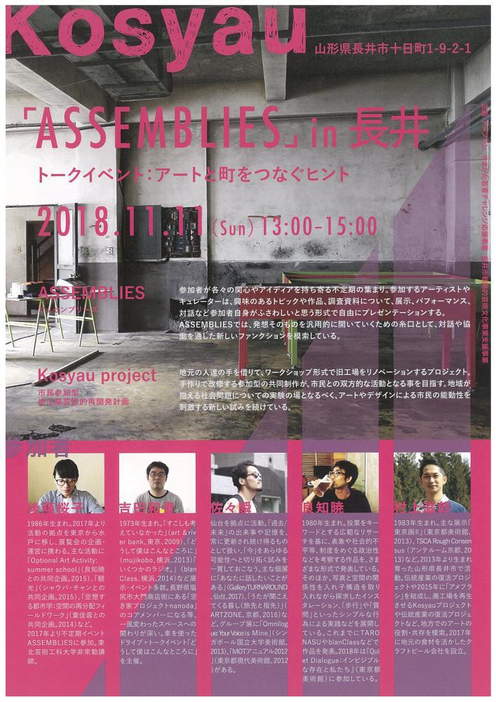 「ASSEMBLIES in 長井」のお知らせです。 アーティストやキュレーターが各々の関心やアイディアを持ち寄って互いの発想を広げていく「ASSEMBLIES」を長井市で出張開催します。 ≪トークイベント≫アートと町をつなぐヒント●日時:2018年11月11日(日)13:00〜15:00●場所:Kosyau(こしゃう) 長井市十日町1-9-2-1●問合せ:アメフラシ(TEL:090-4530-8884) ※詳しくはこちら(PDF914KB)をクリック!