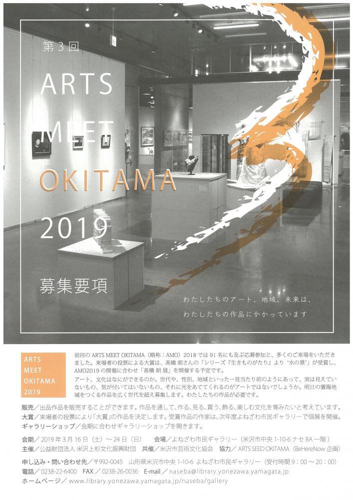 2019年3月16日(土)〜24日(日)、よねざわ市民ギャラリー(ナセBA1階)にて、「ARTS MEET OKITAMA 2019」が開催されます。置賜にゆかりのある、美術作家もしくは作家を志している方を対象に、出品いただく作品を募集しています。応募締め切りは平成31年2月1日(金)必着です。詳しくはこちら(1.72MB)をご覧ください。