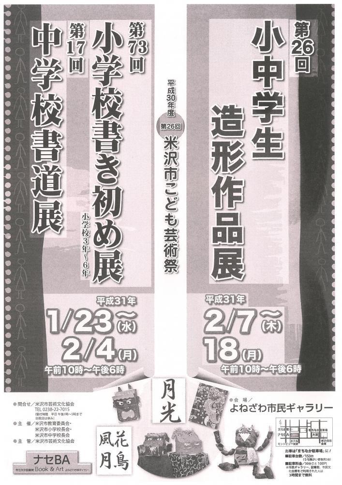 「第26回米沢市こども芸術祭」のお知らせ米沢市内の小中学校・米沢養護学校の児童生徒が、授業の中で一生懸命に取り組み創り上げた作品が一堂に会します。期間:平成31年1月23日(水)〜2月18日(月) (1)第73回小学校書き初め展・第17回中学校書道展:1/23(水)〜2/4(月) (2)第26回小中学生造形作品展:2/7(木)〜2/18(月)時間:午前10時〜午後6時会場:よねざわ市民ギャラリー「ナセBA」お問合せ:米沢市芸術文化協会(TEL:0238-22-7015)詳しくはこちら(PDF1.61MB)をクリック!