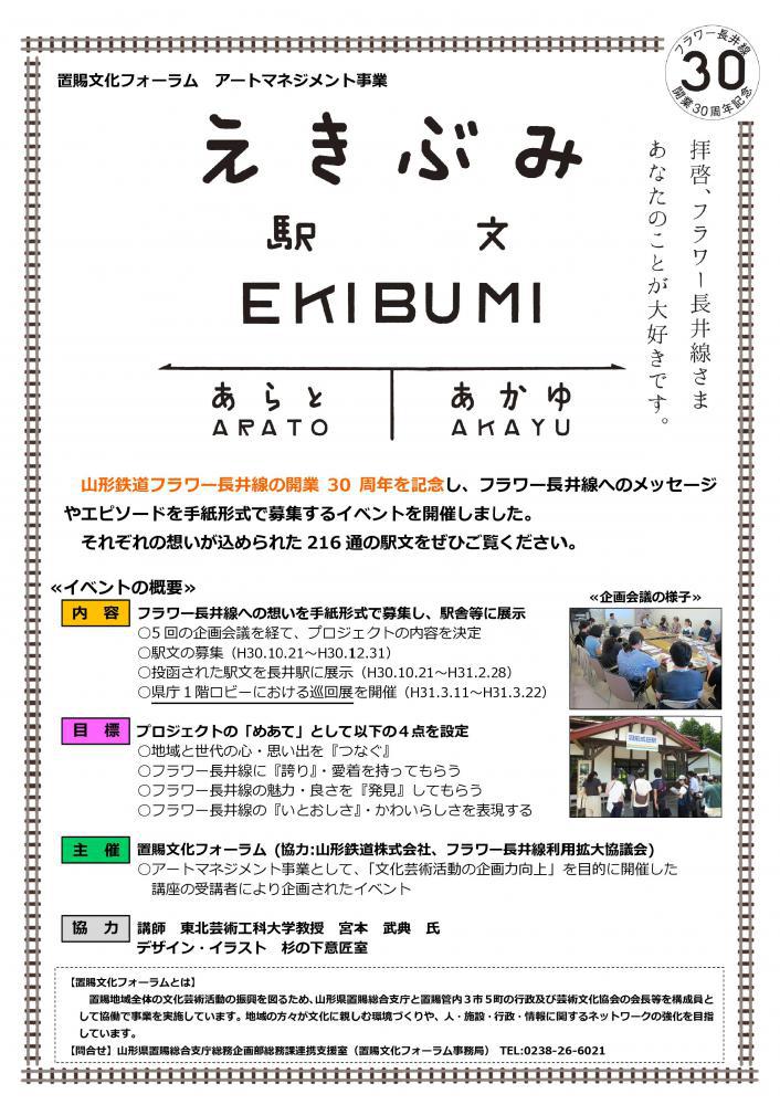 山形鉄道フラワー長井線の開業30周年を記念し、フラワー長井線へのメッセージやエピソードを手紙形式で募集・展示してきたイベント「駅文(えきぶみ)」ですが、このたび、下記により巡回展を開催することとなりました。 それぞれの想いが込められた216通の「駅文」をぜひご覧ください!○開催期間:3月11日(月)〜3月22日(金)※平日のみ○展示時間:各日8:30〜17:15○展示場所:山形県庁1階県民ロビー「ジョンダナホール」 (地図: https://www.pref.yamagata.jp/about/access.html ) また、NHKのニュース番組「やままる」及び「おはよう日本」で「駅文」が紹介され、その動画が「NHK NEWS WEB」で配信中ですので、ぜひご覧ください。○NHK NEWS WEB「記憶つなぐ駅文」 (URL: https://www3.nhk.or.jp/news/cameramanseye/2019_0223.html ) ※1分23秒のショートver.と4分11秒のロングver.がありますので、お好みで切り替えてご覧ください。
