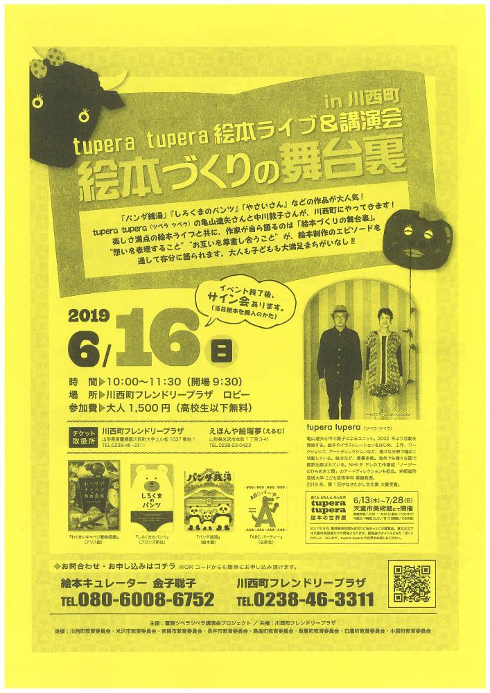 『パンダ銭湯』、『しろくまのパンツ』、『やさいさん』などの作品が大人気!tupera tupera(ツペラ ツペラ)の亀山達矢さんと中川敦子さんが、川西町にやってきます!●日時:2019年6月16日(日)●時間:10:00〜11:30(開場 9:30)●場所:川西町フレンドリープラザ ロビー●参加費:大人1,500円(高校生以下無料)●お問い合わせ・お申し込みはコチラ↓ ・川西町フレンドリープラザ(TEL:0238-46-3311)詳しくはこちら(PDF1.31MB)をクリック!