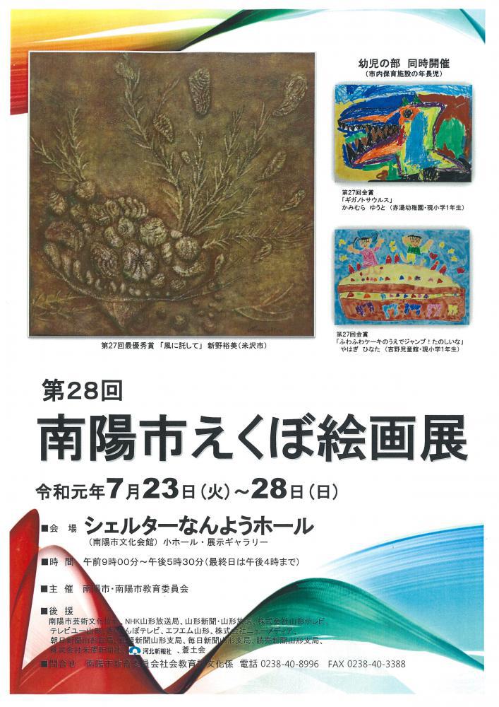 第28回南陽市えくぼ絵画展のお知らせです。●日にち:令和元年7月23日(火)〜28日(日)●会場:シェルターなんようホール(南陽市文化会館)小ホール・展示ギャラリー●時間:午前9時00分〜午後5時30分(最終日は午後4時まで)●お問合せ:南陽市教育委員会社会教育課文化係(TEL:0238-40-8996)詳しくはこちら(PDF979KB)をクリック!