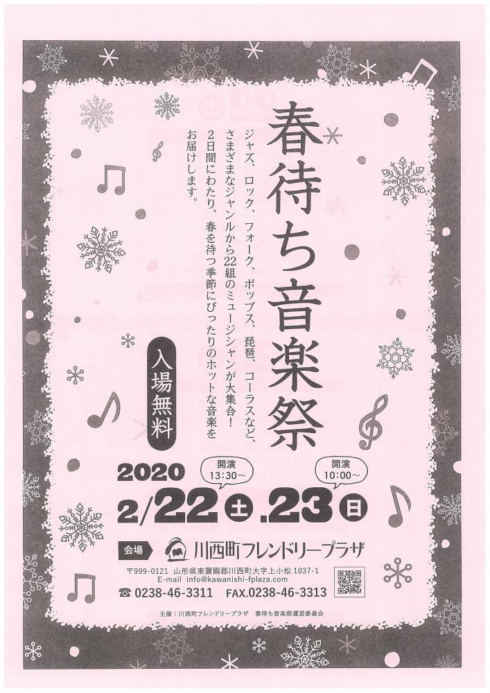 『春待ち音楽祭』のお知らせです。ジャズ、ロックからフォーク、ポップス、琵琶、コーラスなど、さまざまなジャンルから22組のミュージシャンが大集合!2日間にわたり、春を待つ季節にぴったりのホットな音楽をお届けします。■日時:2020年2月22日(土)開場13:00〜終演16:30 23日(日)開場9:30〜終演16:00■入場料:無料■会場:川西町フレンドリープラザ■主催:川西町フレンドリープラザ 春待ち音楽祭運営委員会■問合せ:川西町フレンドリープラザ(電話0238-46-3311)詳しくはこちら(PDF2.6MB)をクリック!
