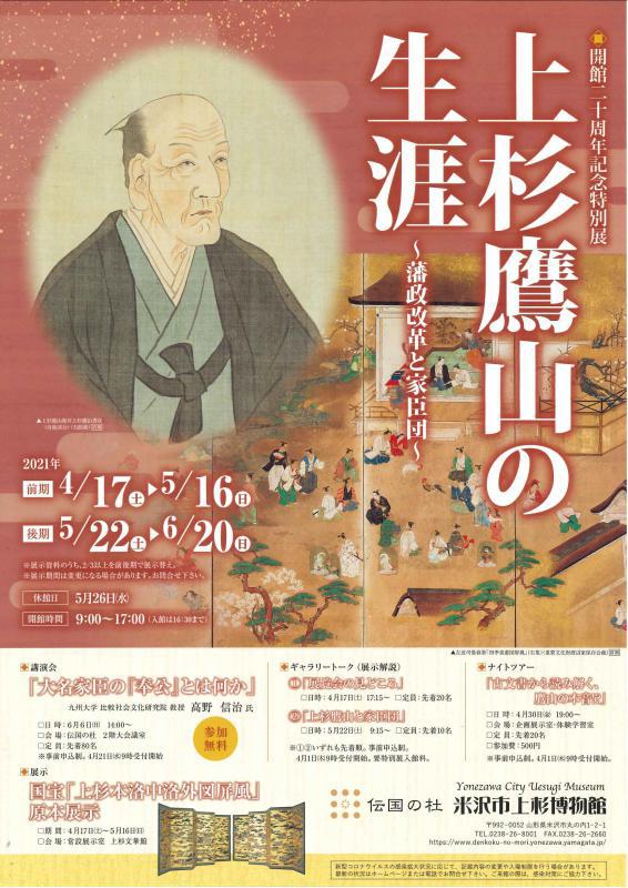 4月17日(土)よりはじまる特別展のお知らせです。開館二十周年記念特別展「上杉鷹山の生涯〜藩政改革と家臣団〜」 明和四年(1767)に十七歳で第九代米沢藩主となり、改革に取り組んだ上杉鷹山の七十二年の生涯を、家臣団との関係を中心に紹介します。 高鍋藩秋月家から養子入りした若き鷹山は、破綻の危機にあった米沢藩を再建すべく、竹俣当綱はじめ改革派家臣の叱咤激励を受けて改革に取り組みました。名門上杉家の継承、累積した借金の返済、農村の活性化、産業の育成、軍備の再編…。山積する課題に対し、奉行(家老)層の主導のもと、実務を担った中・下級藩士や、学者・医師らも大きな役割を果たしました。重臣の反発や家臣団内部の対立、天災や幕府から課される役負担、竹俣の失脚と鷹山の隠居による中断といった危機を乗り越え、改革は五十年以上続けられました。鷹山の治績は三十代から全国的に注目され、やがてその言行は藩内の規範として家臣達にも共有されていきます。 今年は鷹山の生誕二百七十年であり、二百回忌にあたります。本展覧会では、米沢藩上杉家の存続をかけて苦闘した、鷹山の人間像と家臣団の働きぶりに注目します。 【期間】4月17日(土)〜6月20日(日) 前期:4月17日(土)〜5月16日(日) 後期:5月22日(土)〜6月20日(日)【休館日】5月26日(水)【開館時間】9:00〜17:00(チケット販売は16:30まで)【入館料】一般700円(560円)/高大生300円(240円)/中学生以下無料 ※( )は20名以上の団体料金 ※常設展とセットのみ ♦入館料無料の日 5月5日(水・祝)こどもの日 小中高生入館無料! 5月18日(火) 国際博物館の日 どなたでも入館無料! 【ギャラリートーク】展示解説 ※事前申込制 4月1日(木)9:00〜受付開始 日 時 : 4月17日(土) 17:15〜「展覧会の見どころ」 5月22日(土) 9:15〜「上杉鷹山と家臣団」 場 所 : 米沢市上杉博物館 企画展示室 定 員 : 4月17日(土) 先着20名 5月22日(土) 先着10名 担当学芸員 : 佐藤正三郎 ※特別展の入館料が必要です。 【ナイトツアー】 ※事前申込制 4月1日(木)9:00〜受付開始「古文書から読み解く、鷹山の本音!?」 日 時 : 4月30日(金) 19:00〜 場 所 : 米沢市上杉博物館 企画展示室・体験学習室 定 員 : 先着20名 参加費 : 500円 【講演会】 ※事前申込制 4月21日(水)9:00〜受付開始「大名家臣の『奉公』とは何か」 日 時:6月6日(日)14:00〜 会 場:伝国の杜 2階大会議室 定 員:先着80名 参加費:無料 講 師:九州大学比較社会文化研究院教授 高野信治氏 ※ギャラリートーク、ナイトツアー、講演会のお申込み TEL 0238-26-8001 詳しくは当館ホームページをご覧ください。 皆様のご来館を心よりお待ちしております! 【お問い合わせ】 米沢市上杉博物館 0238-26-8001