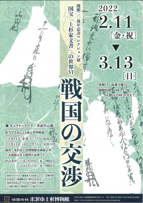 2月11日(金・祝)よりはじまるコレクション展のお知らせです。開館20周年記念コレクション展 国宝「上杉家文書」の世界Y 戦国の交渉 近隣大名と抗争を繰り広げていた戦国大名は、共通の敵を持つ大名や中立的な立場の大名、時には敵対する大名とも交渉し、友好的関係や同盟関係を結び、維持することに努め、自らの立場を守ろうとしました。 このような交渉は、大名同士が対面して行われることは稀でした。使者が派遣される場合、大名の意思を口頭で説明し、より詳しい、具体的なやりとりがなされたと思われます。しかし、その場合でも大名やその側近の文書が相手に渡され、交渉を進める手立てとなりました。また、常に使者の派遣が可能とは限りませんでした。飛脚のように、内容の伝達にはかかわらず、文書を届けるだけの場合もありました。大名同士の意思疎通に文書が果たした役割は、実に大きかったのです。 国宝「上杉家文書」には、長尾氏・上杉氏と諸大名との外交交渉を示す書状が数多く残されており、その特徴の一つに挙げることができます。本展では、これらから戦国大名の外交交渉をめぐるさまざまな様相を紹介していきます。 【期間】2月11日(金・祝)〜3月13日(日)【休館日】毎週月曜日【開館時間】9:00〜17:00(チケット販売は16:30まで)【入館料】一般210円(160円)/高大生110円(80円)/小中生50円(40円) ※( )は20名以上の団体料金 【ギャラリートーク】展示解説 ※事前申込制 日 時 : @2月11日(金・祝) 17:15〜 〈延期〉2月23日(水・祝)17:15〜 A3月13日(日) 9:15〜 ※@は1月20日(木)、Aは2月15日(火)の9:00より受付開始 場 所 : 米沢市上杉博物館 企画展示室 定 員 : @20名 A10名 担当学芸員 : 阿部哲人 ※コレクション展の入館料が必要です。 ※ギャラリートークのお申込み TEL:0238-26-8001 展覧会の詳細は当館ホームページをご覧ください。 皆様のご来館を心よりお待ちしております! 【お問い合わせ】 米沢市上杉博物館 0238-26-8001