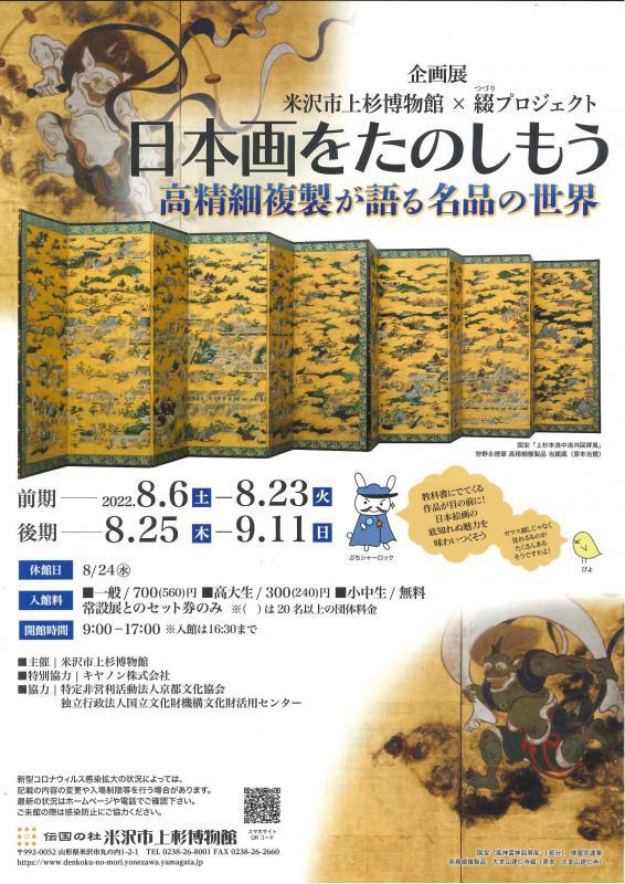 【明かり】紙や絹に顔料で描かれた作品は、照明による劣化防止のため通常の展示室では照度を落として展示します。高精細複製展示の今回は、いつもの展示室より少し明るめ。絵師たちの筆遣いの細部までじっくり鑑賞することができます。行灯風のあかりで雰囲気も。 展覧会詳細はこちら【お問い合わせ】 米沢市上杉博物館 0238-26-8001
