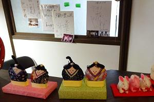 と書かれてありました。可愛らしいフェルトの3羽のウサギと一緒に多勢さんの手芸の先生が作られた隠岐の島で獲れるヒオウギガイを使ったお雛様も飾りました。