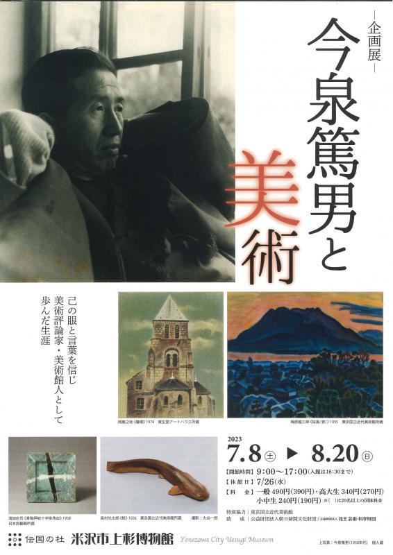 7月8日(土)よりはじまる企画展のお知らせです。 企画展「今泉篤男と美術」 己の眼と言葉を信じ 美術評論家・美術館人として歩んだ生涯 今泉篤男(いまいずみあつお 1902〜1984 米沢市出身)は、戦前から評論活動をスタートし、国内外の美術工芸に関する幅広い分野を対象とした美術評論家です。一方で、東京国立近代美術館初代次長、京都国立近代美術館初代館長を務めた美術館人でもありました。国立美術館のほか、資生堂ギャラリーをはじめとする多くの美術館運営に関わり、評論家としては1950年代に日本の「近代絵画」をめぐる問題提起で「今泉旋風」を巻き起こすなど、今日でも美術界全体に今泉の足跡を見ることが出来ます。 本展では、今泉篤男の遺した多彩な業績を、ゆかりの作家の作品と今泉の言葉を通して紹介します。 【期間】7月8日(土)〜8月20日(日) 【休館日】7月26日(水) 【開館時間】9:00〜17:00(チケット販売は16:30まで) 【入館料】一般490円(390円)/高大生340円(270円)/小中生240円(190円) ※( )は20名以上の団体料金 【ギャラリートーク】展示解説 ※申し込み不要 日 時 : 7月8日(土) 14:00〜 会 場 : 米沢市上杉博物館 企画展示室 定 員 : なし 参 加 費 : 企画展入館料 担当学芸員 : 遠藤 友紀 【講演会】※事前申込制 只今受付中!「今泉篤男先生と父法林の思い出」 日 時 : 7月15日(土) 14:00〜15:30 会 場 : 伝国の杜 2階大会議室 定 員 : 120名 参 加 費 : 無料 講 師 : 日本芸術院会員/日本美術院同人 福王寺 一彦 氏 【ナイトツアー】※事前申込制 只今受付中!「〈今泉篤男と美術〉をみる」 日 時 : 7月28日(金) 19:00〜20:30 定 員 : 20名程度(中学生以下は保護者同伴) 参 加 費 : 500円 ※講演会・ナイトツアーのお申し込みは TEL【0238-26-8001】ほか 主な展示資料等、詳しくは当館ホームページをご覧ください。 皆様のご来館を心よりお待ちしております! 【お問い合わせ】 米沢市上杉博物館 0238-26-8001