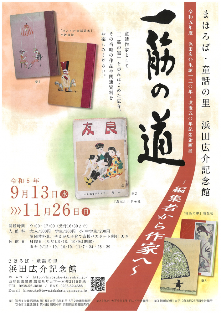 浜田広介記念館にて、浜田広介生誕130年・没後50年記念企画として、浜田広介の企画展を開催します。編集者から童話作家として独立し、筆一本で歩むことを決意した浜田広介の当時の作品や関連資料をお楽しみください。ご来場お待ちしております!開催期間:令和5年9月13日(水)〜11月26日(日)開館時間:9:00〜17:00場所:浜田広介記念館料金:大人 500円 学生 300円 小中生200円お問い合わせ:浜田広介記念館(0238-52-3838)詳細はコチラ