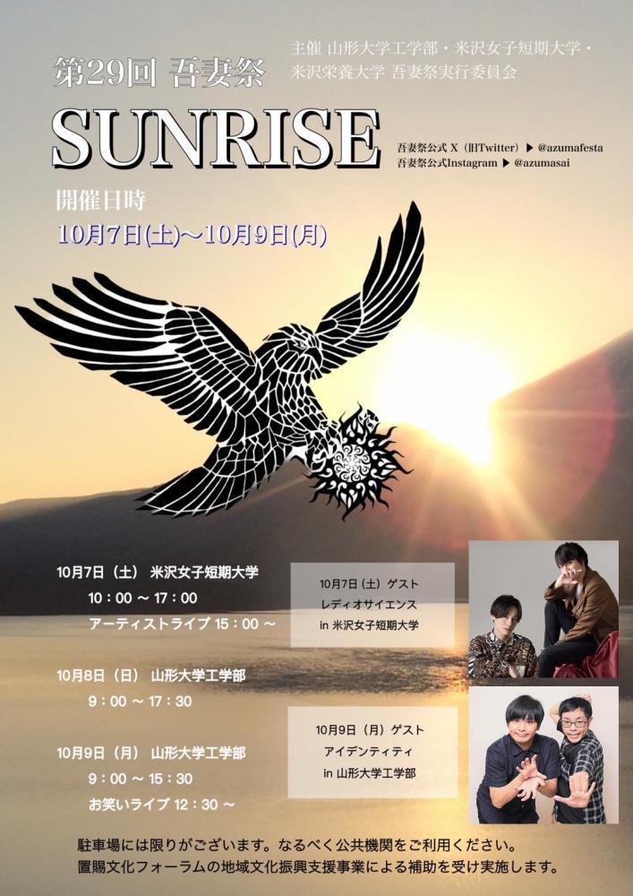 第29回吾妻祭が、米沢女子短期大学・山形大学工学部で開催されます。アーティストライブやお笑いライブの他、置賜地域の伝統工芸が体験できるブースも設置されます。この機会にぜひ、ご来場ください。<開催日時・場所>・令和5年10月7日(土) 米沢女子短期大学 10:00〜17:00・令和5年10月8日(日) 山形大学工学部 9:00〜17:30・令和5年10月9日(月) 山形大学工学部 9:00〜15:30<料金>無料※駐車場には限りがございます。なるべく公共交通機関をご利用ください。詳細はコチラ