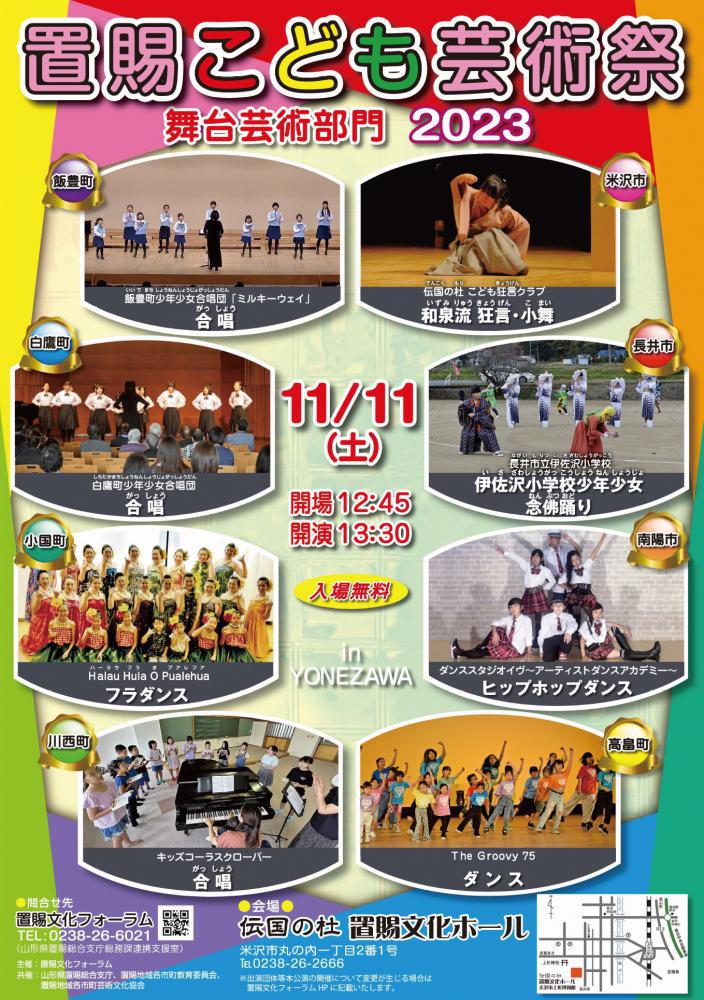 伝国の杜置賜文化ホールにて「置賜こども芸術祭舞台芸術部門」が開催されます!置賜各地で伝統芸能などの文化活動に取り組んでいるこどもたちが一堂に会し、日ごろの練習の成果を披露します。今年は4年ぶりに置賜3市5町の全ての団体が参加します。舞台上でのこどもたちの一生懸命な姿をぜひ、ご覧ください!<日時>令和5年11月11日(土)開場12:45 開演13:30<場所>伝国の杜置賜文化ホール(米沢市丸の内1丁目2−1)<出演団体>【米沢市】伝国の杜こども狂言クラブ【長井市】長井市立伊佐沢小学校【南陽市】ダンススタジオイヴ 〜アーティストダンスアカデミー〜【高畠町】The Groovy 75【川西町】キッズコーラスクローバー【小国町】Halau Hula O Pualehua【白鷹町】白鷹町少年少女合唱団【飯豊町】飯豊町少年少女合唱団「ミルキーウェイ」<入場料>無料詳細はコチラ