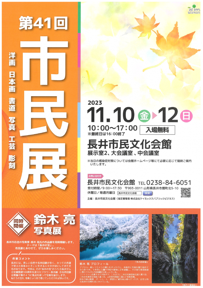 長井市民文化会館にて、「第41回市民展」が開催されます。洋画、日本画、書道など、様々な作品が展示されるほか、長井市在住の写真家鈴木亮氏による作品展を同時開催します。この機会にぜひ、ご来場ください。<開催日時>令和5年11月10日(金)〜12日(日) 10:00〜17:00※最終日は、16:00終了<場所>長井市民文化会館 展示室2、大会議室、中会議室<料金>無料<問い合わせ>長井市民文化会館 TEL:0238-84-6051詳細はコチラ