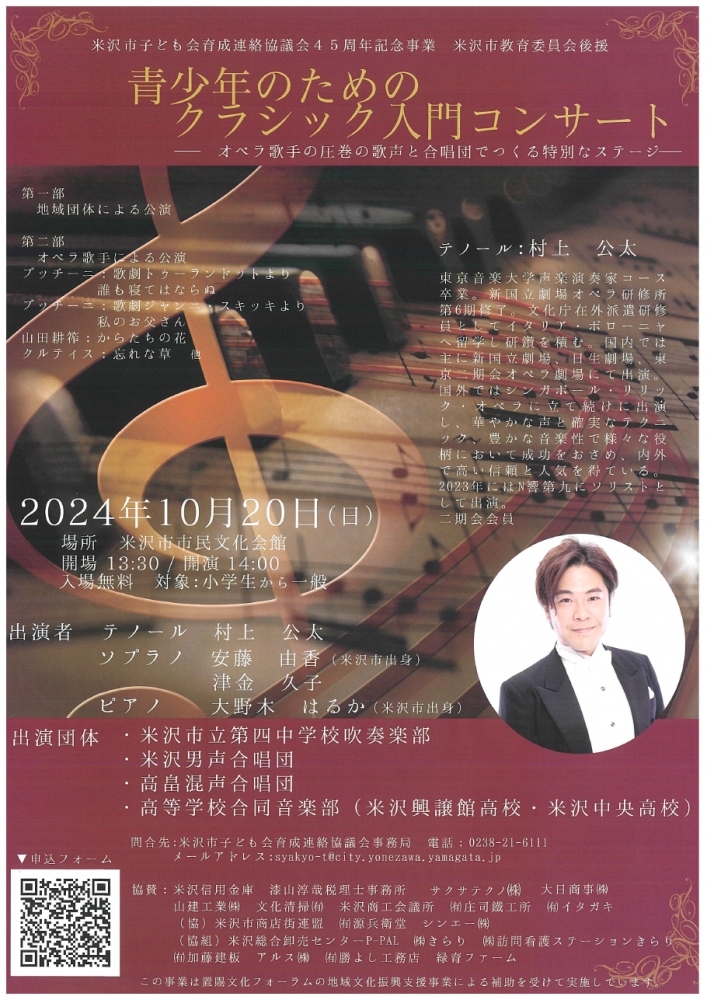 置賜総合支庁、置賜3市5町の文化行政担当部局、各市町の芸術文化協会などで組織する置賜文化フォーラムでは、置賜地域の文化振興と地域活性化を図ることを目的に、置賜地域の住民が主体となった文化事業に対し、補助金を交付しています。今年度採択された「米沢市子ども会育成連絡協議会」では、45周年記念事業として、地域の音楽団体による公演やオペラ歌手による公演を行います。この機会にぜひ、ご来場ください。<開催日時>令和6年10月20日(日) 開場:13:30 開演:14:00<場所>米沢市市民文化会館<入場料>無料※来場者数把握のため、事前申し込みに御協力をお願いいたします。申込フォームhttps://apply.e-tumo.jp/city-yonezawa-yamagata-u/profile/userLogin_initDisplay?nextURL=CqTLFdO4voa96Y73xXv0Xt7dRrdLP0zYtUINsUzZVMvOb9TDli5Nf%2F8YVvgnW6IzbH%2FzehEwMcnD%0D%0Aw2FP2V8XoE%2Bm4Zo4btwgPg7R1EzFuN%2BoxlqAAx6zIMEMGu7y8rKOu%2F2pnQTLAb0%3D%0D%0A<出演者>テノール 村上公太ソプラノ 安藤由香(米沢市出身) 津金久子ピアノ 大野木はるか(米沢市出身)<出演団体>米沢市立第四中学校吹奏楽部米沢男声合唱団高畠混声合唱団高等学校合同音楽部(米沢興譲館高校・米沢中央高校)<お問い合わせ先>米沢市子ども会育成連絡協議会事務局電話:0238-21-6111メール:syakyo-t@city.yonezawa.yamagata.jp詳細はコチラ