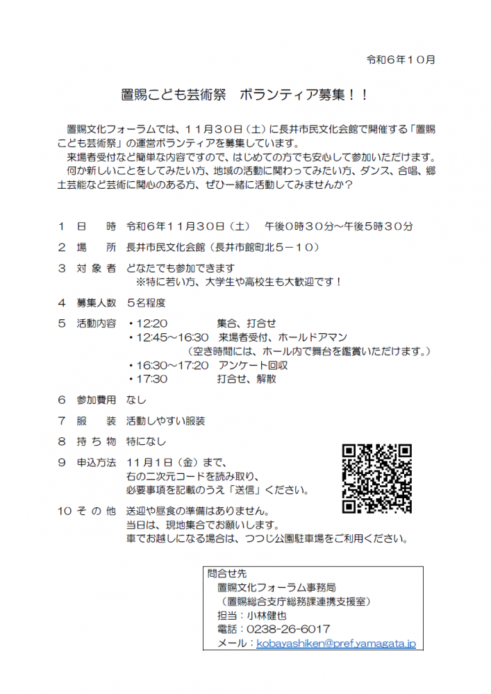 置賜文化フォーラムでは、11月30日(土)に長井市民文化会館で開催する「置賜こども芸術祭」の運営ボランティアを募集しています。来場者受付など簡単な内容ですので、はじめての方でも安心して参加いただけます。何か新しいことをしてみたい方、地域の活動に関わってみたい方、ダンス、合唱、郷土芸能など芸術に関心のある方、ぜひ一緒に活動してみませんか?1 日 時 令和6年11月30日(土) 午後0時30分〜午後5時30分2 場 所 長井市民文化会館(長井市館町北5−10)3 対 象 者 どなたでも参加できます※特に若い方、大学生や高校生も大歓迎です!4 募集人数 5名程度5 活動内容 ・12:20 集合、打合せ・12:45〜16:30 来場者受付、ホールドアマン(空き時間には、ホール内で舞台を鑑賞いただけます。)・16:30〜17:20 アンケート回収・17:30 打合せ、解散その他、詳細はチラシをご覧ください。<申込方法>下記URLより申込ください。https://docs.google.com/forms/d/1K8FrQMUZwXg7gDisdkWLNsUIeM_Xd0mzduoHHG3kjKk/edit<お問い合わせ先>置賜文化フォーラム事務局(置賜総合支庁総務課連携支援室)電話:0238-26-6017メール:kobayashiken@pref.yamagata.jp
